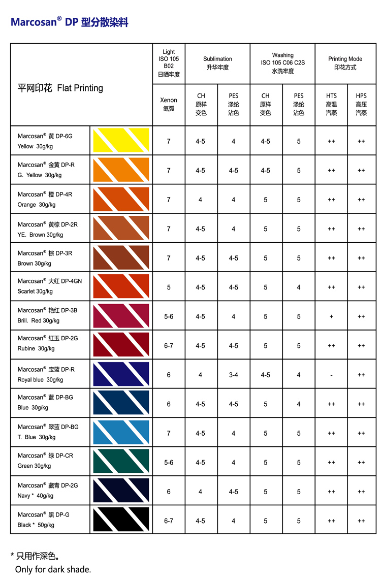 性能: ● Marcosan?DP 顏色鮮艷, 具有良好的升華牢度 |