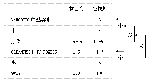 1、染料:把MARCOZOL®CDR型染料用做可拔性活性染料。以MARCOCION®P型染料用做入色染料。請參考本司資料選擇可拔性與穩(wěn)定性良好的染料。