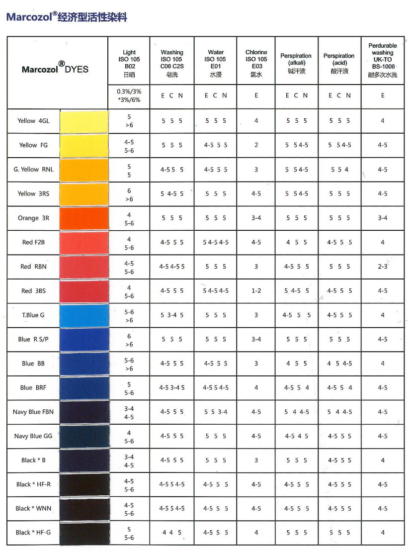 ● 經濟型的活性染色染料, 適合大多數(shù)染色工藝 ● 部分耐堿性的染料適合二相法工藝 ● 色牢度優(yōu)良